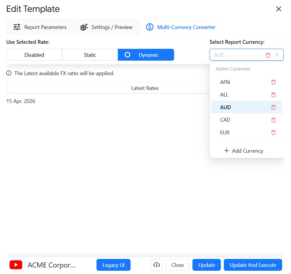 Using Latest Rates: If you select "Use Latest Rates" and click "Execute," the report uses the latest exchange rate from the provider each time you refresh the report.