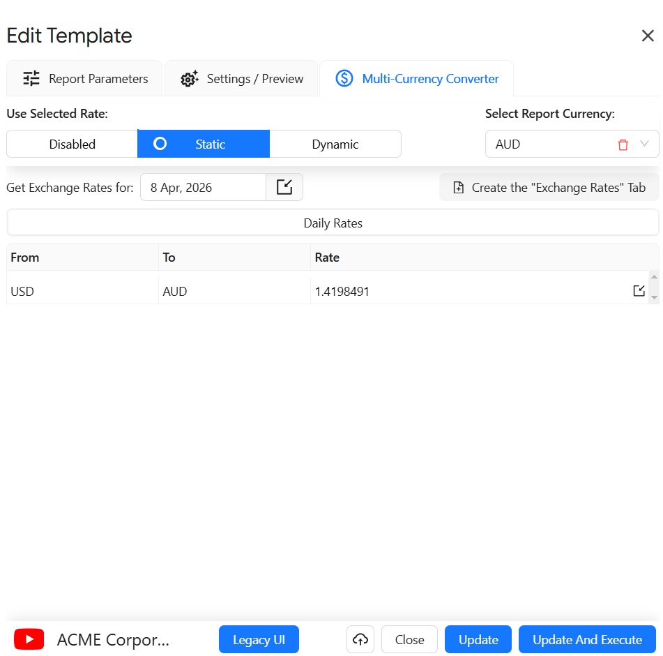 Using Custom Rates: Choose "Use Custom Rates," specify a date, and decide whether to get rates directly or create a separate tab with custom rates. This feature lets you manually adjust exchange rates for the report.