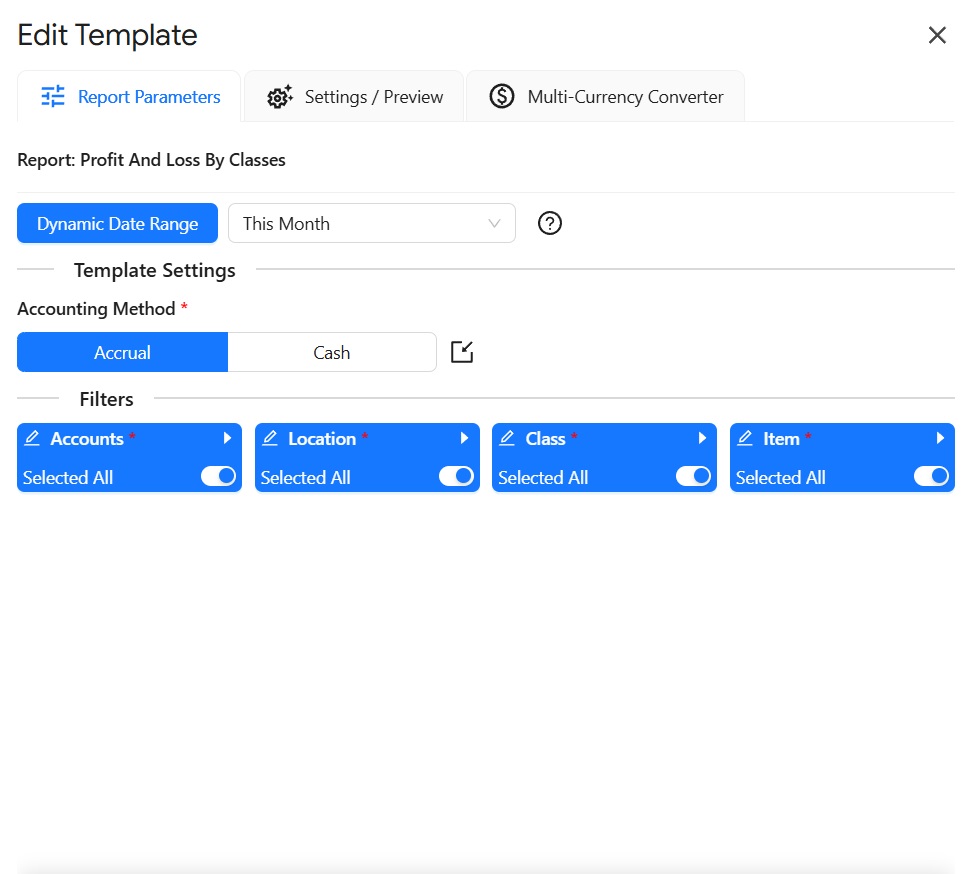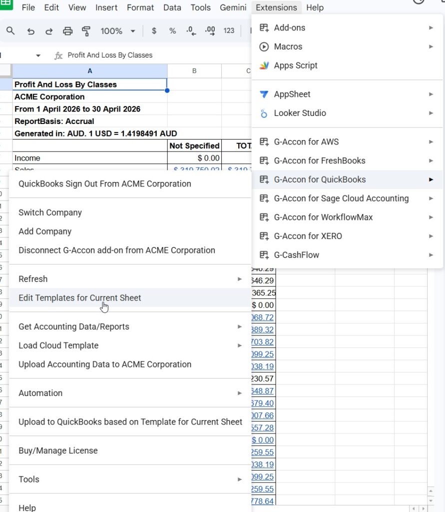 Export Profit And Loss Report By Classes into Google Sheets