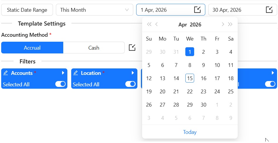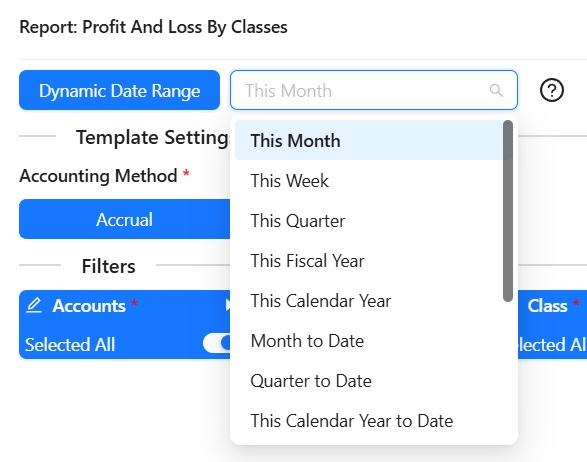 You have the ability to set up the Dynamic Date Range. The report data will be calculated based on the selected Date Range. For your convenience, there are pre-populated values such as This Month, This Quarter, This Year, Last Month, and so on.